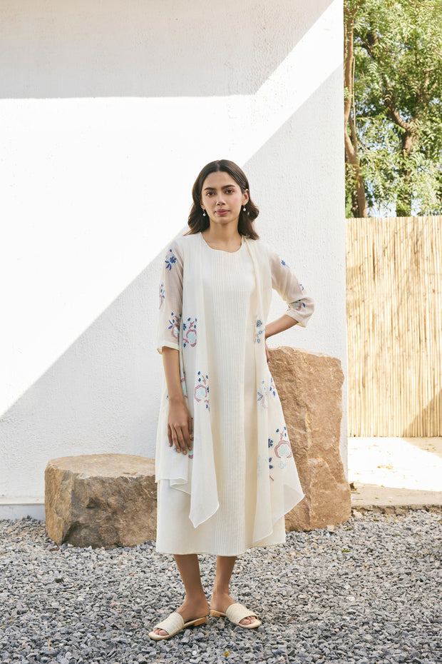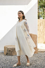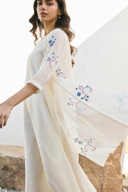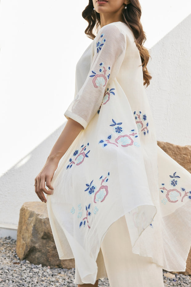 Blue Rose Embroidered Jacket is adorned with intricate embroidery along the Embroidered V-neckline, accented by scalloped detailing, it exudes refined charm. With its overlap style and asymmetrical hemline, complemented by an embroidered belt at waist line, it's a timeless addition to elevate any ensemble.