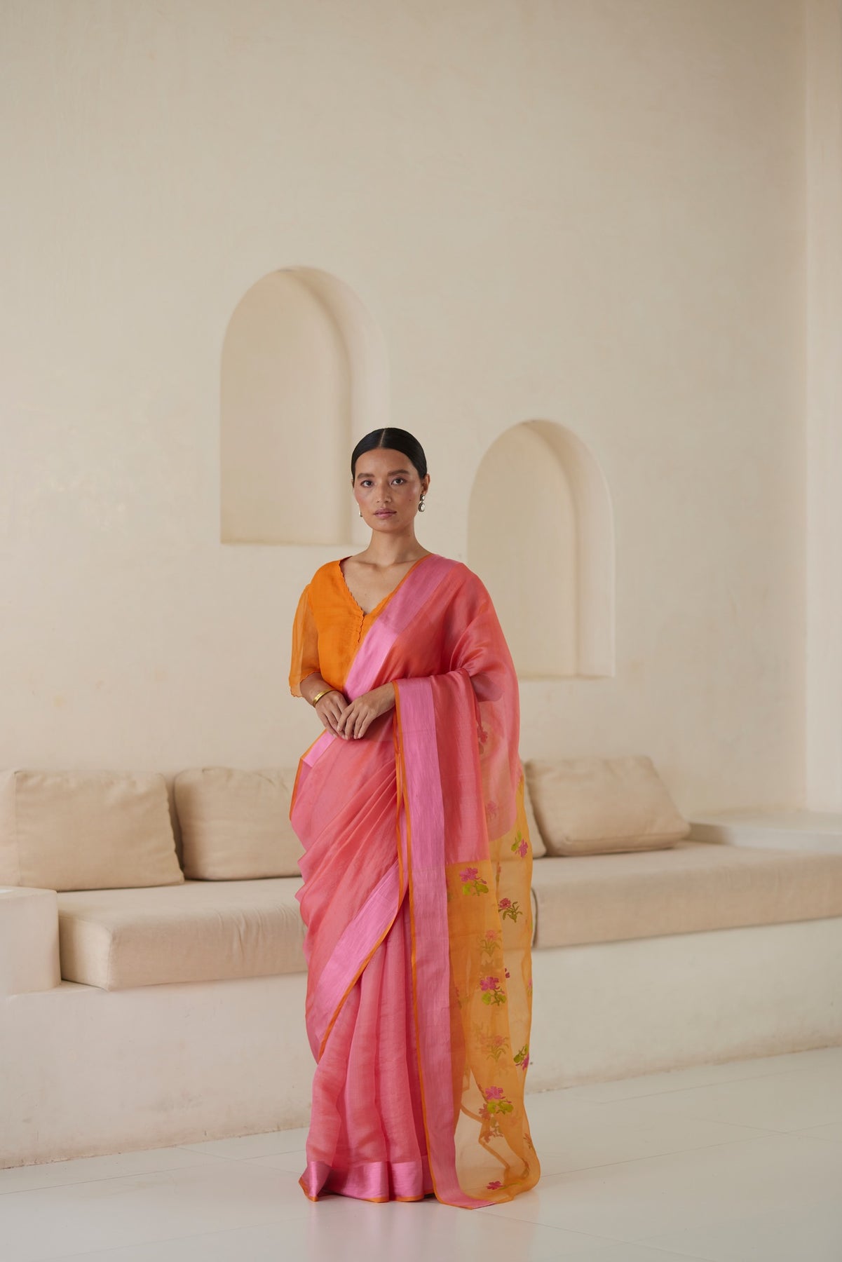 The Fleeting Moments blouse is crafted in handwoven organza silk, featuring scalloped embroidery edges all over. It is lined with handwoven mulberry silk for that extra sheen.