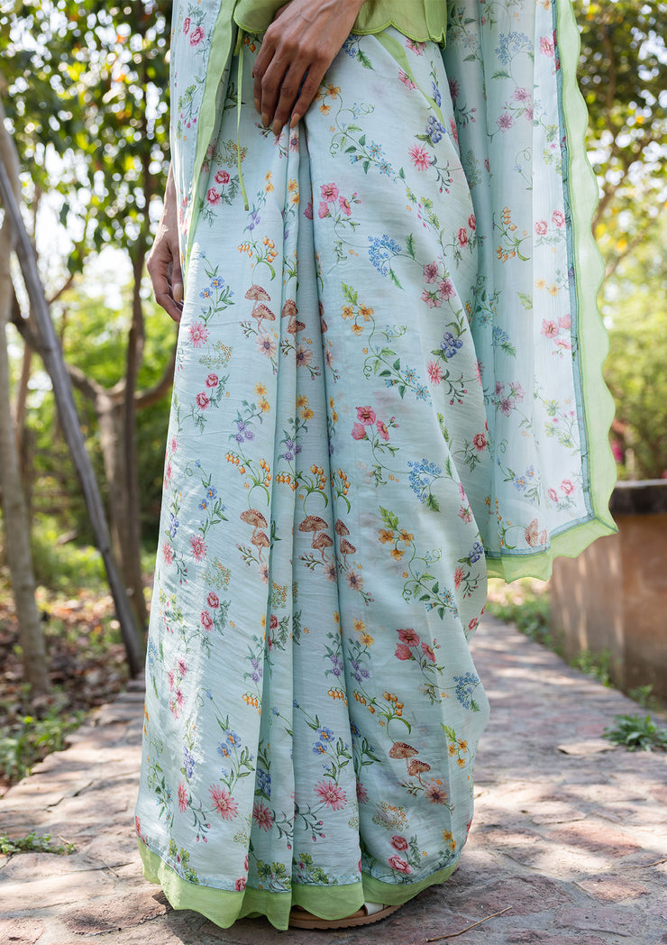 This handwoven saree is adorned with a hand-painted, forest-inspired print - with wildflowers, mushrooms and berries - on a bed of organza mulberry silk. Its green scalloped organza border adds a soft contrast, echoing the hush of dawn in bloom.