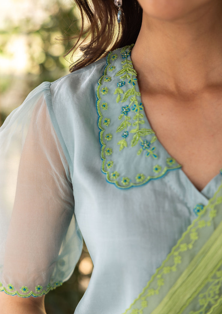 Like new leaves stirred by a gentle breeze, the Whispering Ivy saree exudes freshness and finesse.