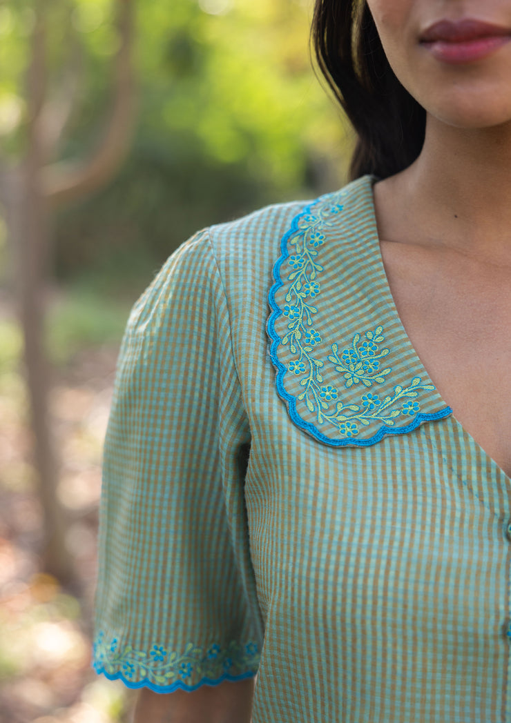 The Sweet Caress Blouse is crafted from handwoven fine silk khadi and features an embroidered scalloped collar, dainty embroidery on the sleeves and buttons, and a front opening for effortless ease.