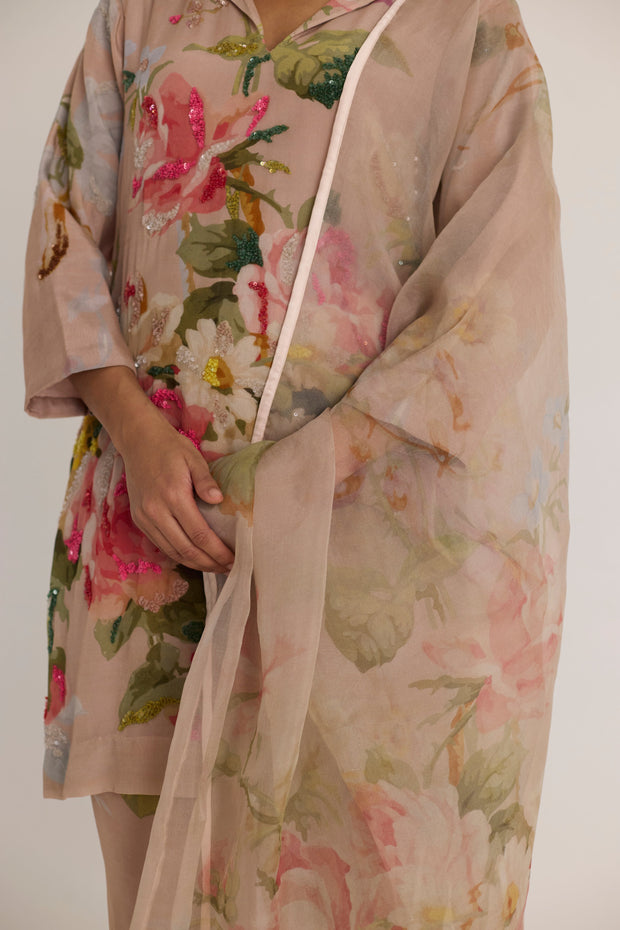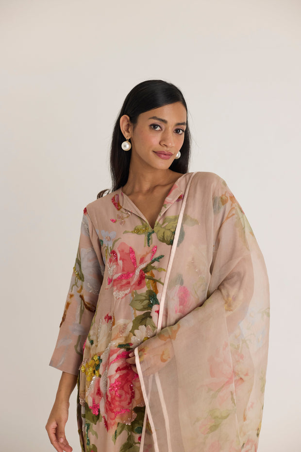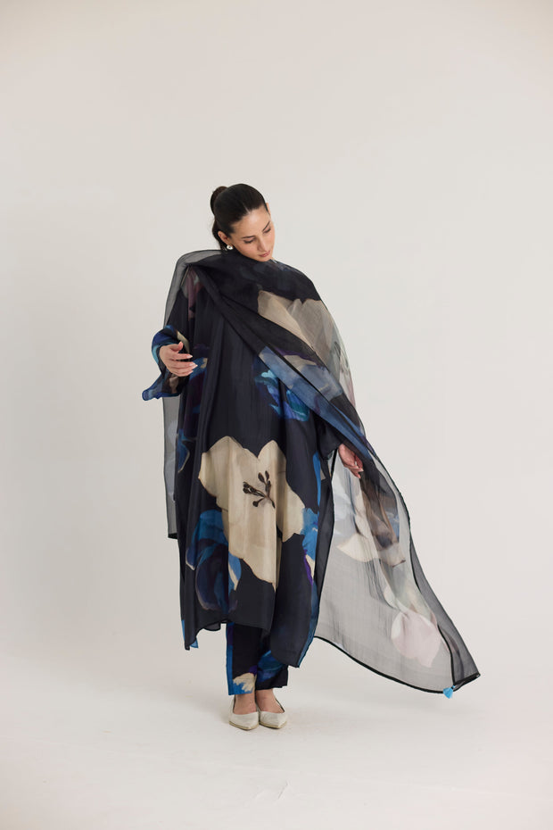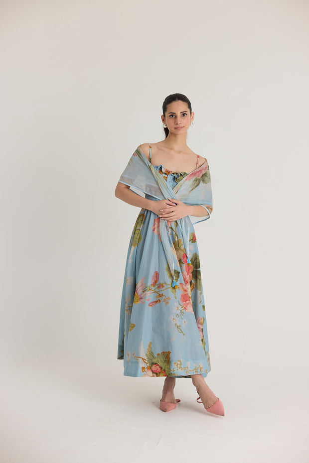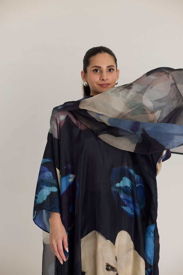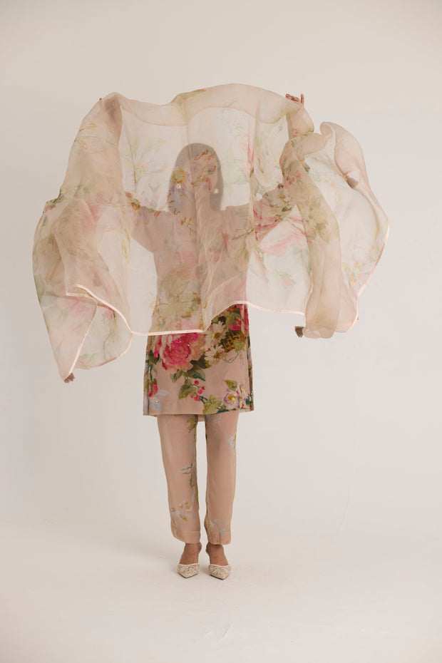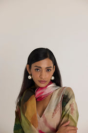 This ethereal scarf showcases a hand-painted floral watercolor print, blending soft pinks, lush greens, warm yellows, and deep earthy hues. The fluid brushstroke effect creates a dreamy, artistic aesthetic, making it a statement accessory for any wardrobe. The delicate tassel accents at the corners add a subtle touch of detail, enhancing its elegant charm.