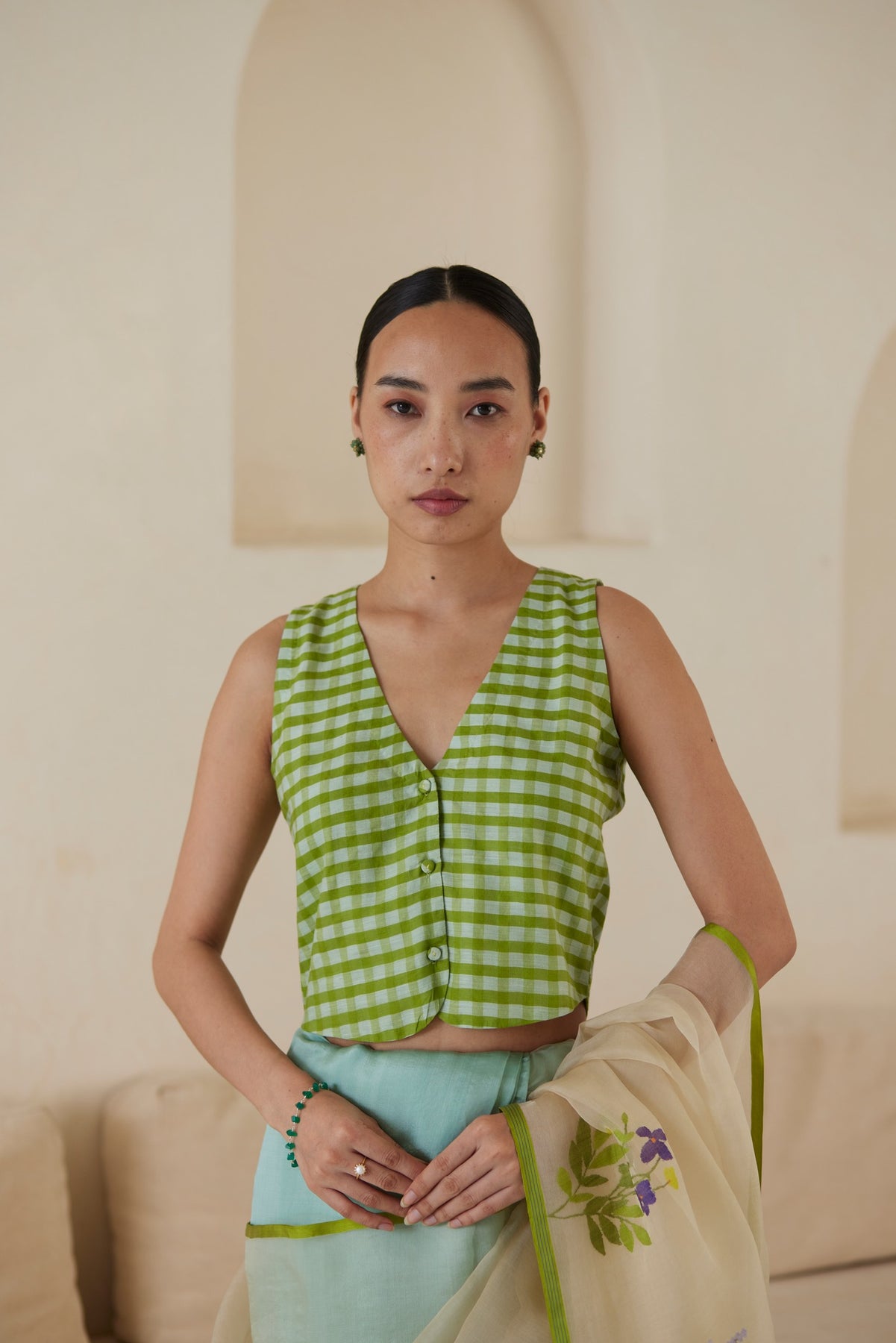 This saree is paired here with the Sisterhood Sonnet Gingham Green Blouse (can be bought separately).