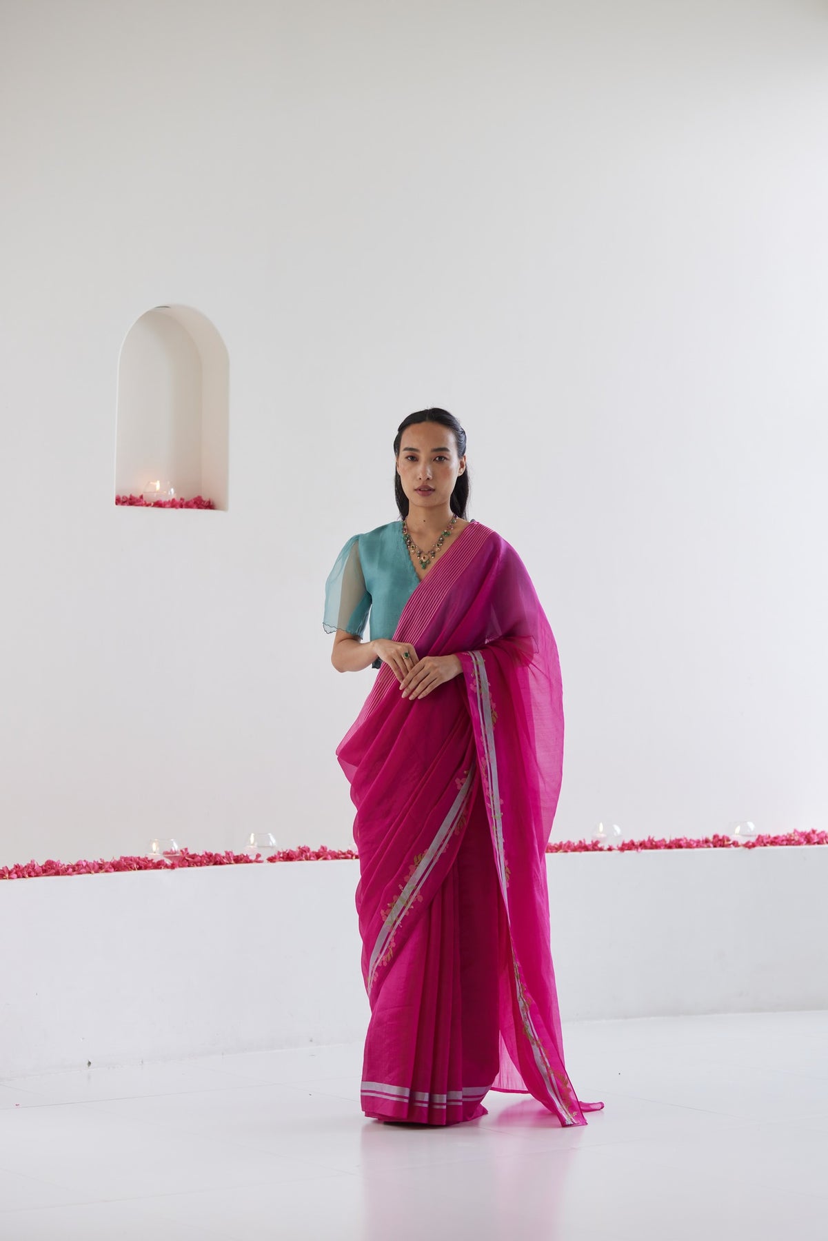 The Fleeting Moments blouse is crafted in handwoven organza silk, featuring scalloped embroidery edges all over. It is lined with handwoven mulberry silk for that extra sheen.