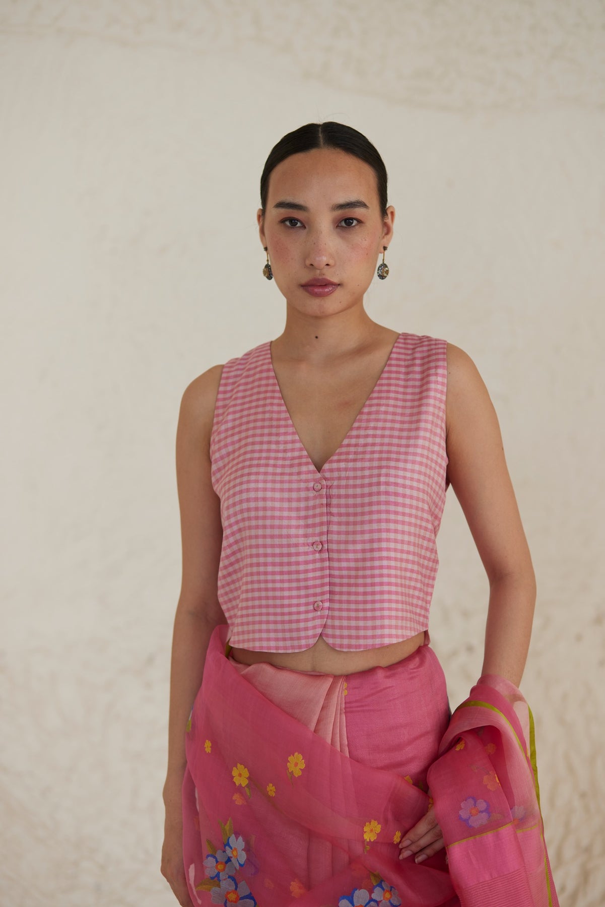 This saree is paired here with the Sisterhood Sonnet Gingham Pink Blouse (can be bought separately).
