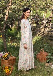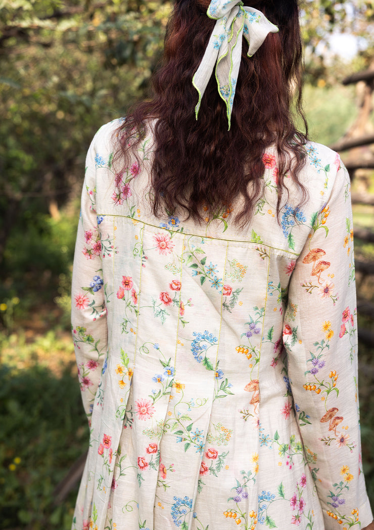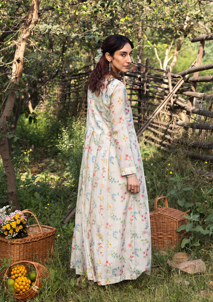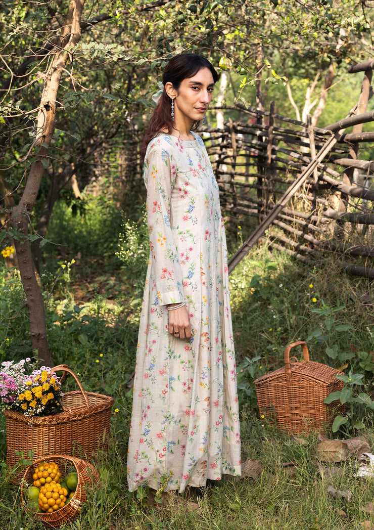 Crafted from handwoven fine silk khadi, this maxi dress features a hand-painted, forest-inspired print, with delicate wildflowers, mushrooms, and berries. This pleated dress, with full sleeves and a soft boat neckline, is gentle and charmingly feminine. The dress comes with a cotton silk slip.