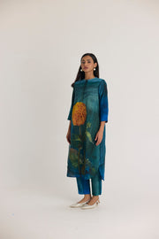 A sophisticated kurta set featuring a mesmerizing deep teal base, reminiscent of watercolor brushstrokes. The highlight of the design is a striking, oversized floral print of a golden dahlia, adding a bold yet elegant touch. The relaxed silhouette, round neckline, and delicate buttoned placket enhance the effortless charm of this piece.