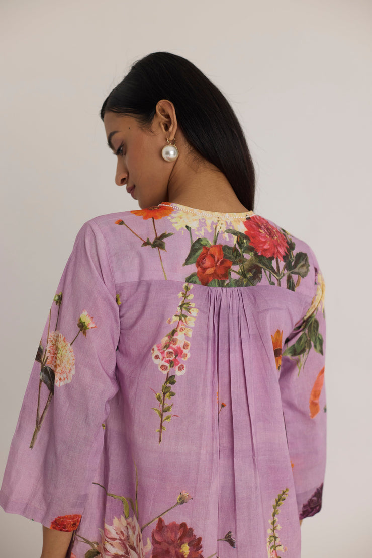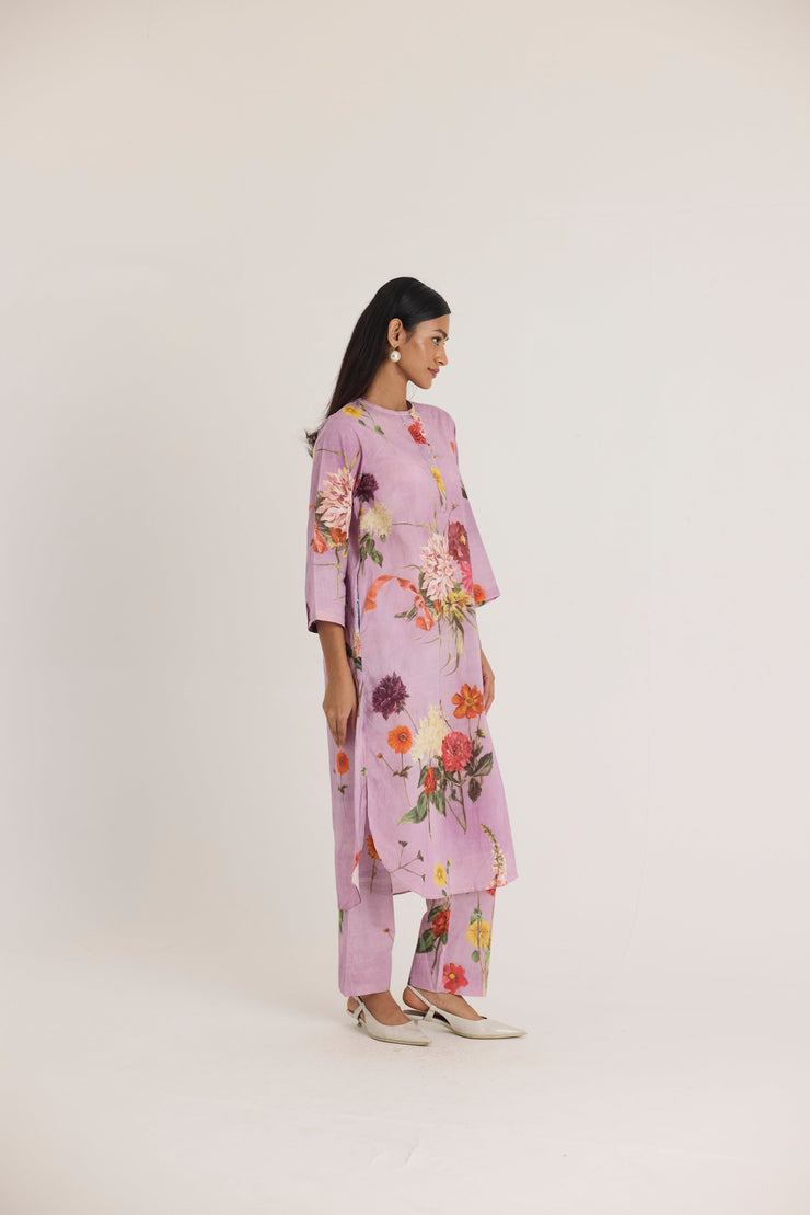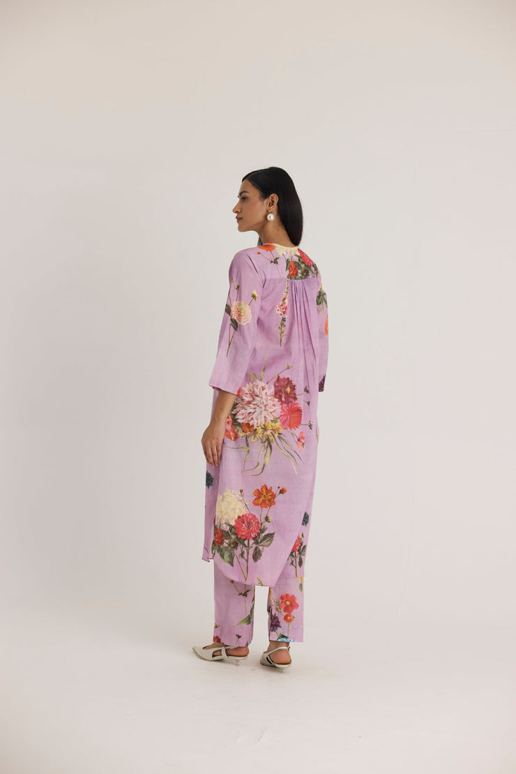 This flowy kurta set features a captivating floral print that brings nature to life. Featuring an array of vibrant blossoms, including hydrangeas, marigolds, and chrysanthemums, the print is a harmonious mix of bold and delicate flowers. The placement of blooms gives an organic, hand-painted feel, making the dress both artistic and elegant.