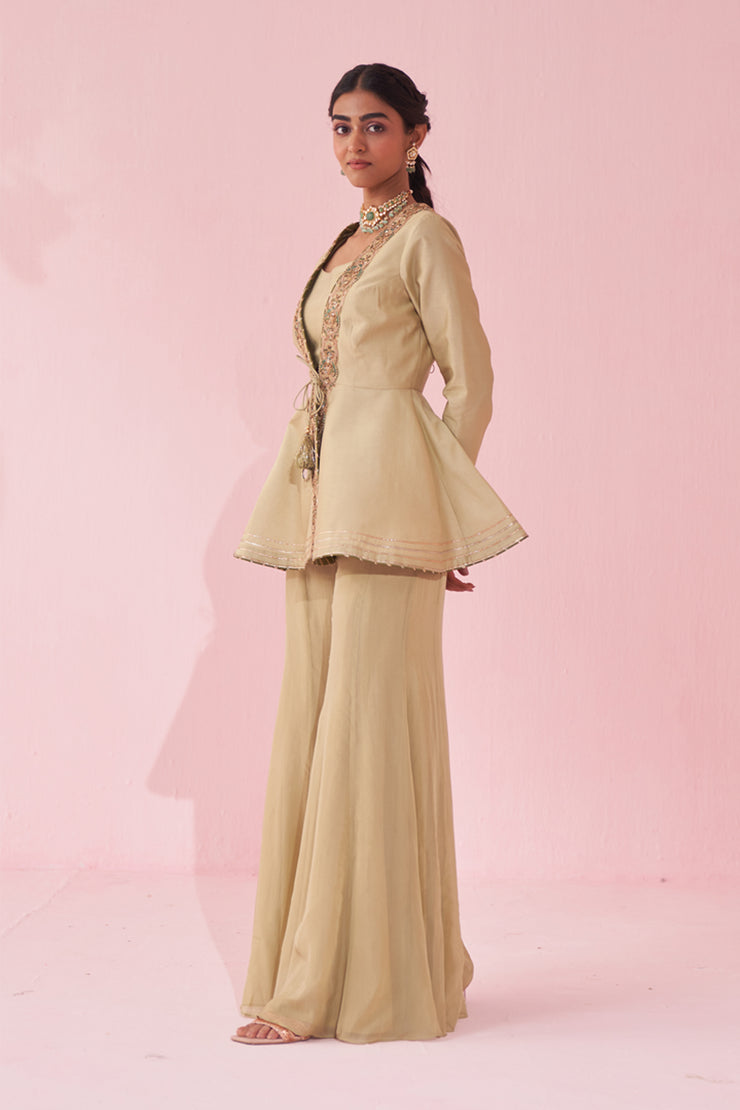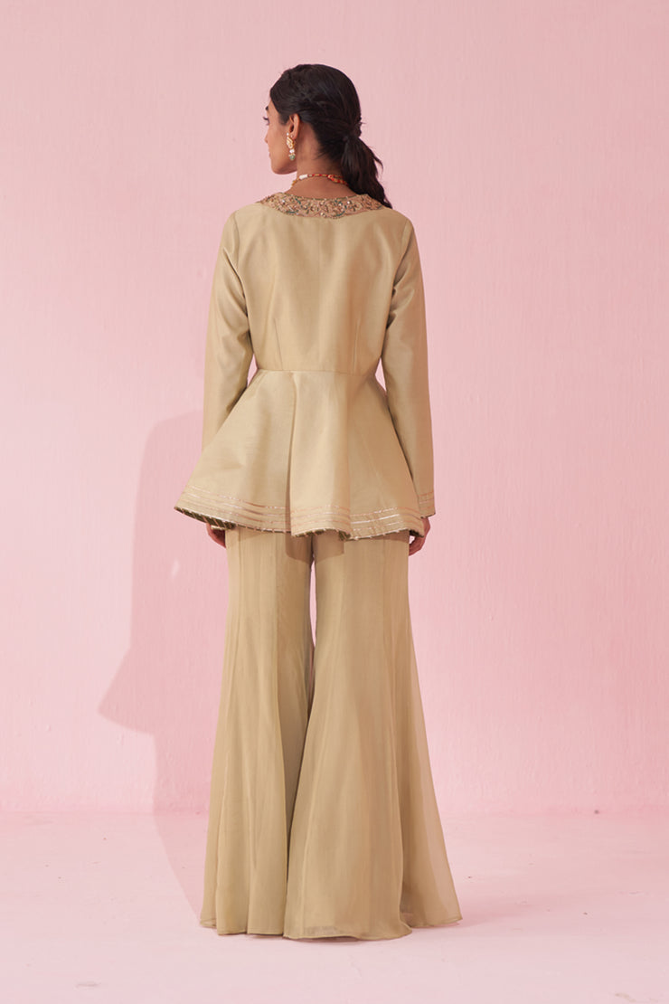 Elevate your festive wardrobe with the Gungun Green Sharara Set. Featuring an embroidered peplum and flowy sharara, this set seamlessly blends traditional charm with modern elegance. Perfect for any special celebration, add a touch of grace and sophistication to your look.