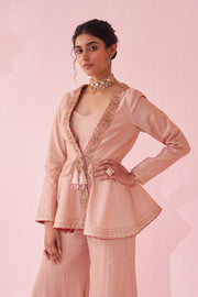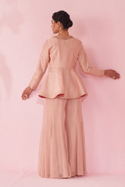 Elevate your festive wardrobe with the Gungun Blush Pink Sharara Set. Featuring an embroidered peplum and flowy sharara, this set seamlessly blends traditional charm with modern elegance. Perfect for any special celebration, add a touch of grace and sophistication to your look.