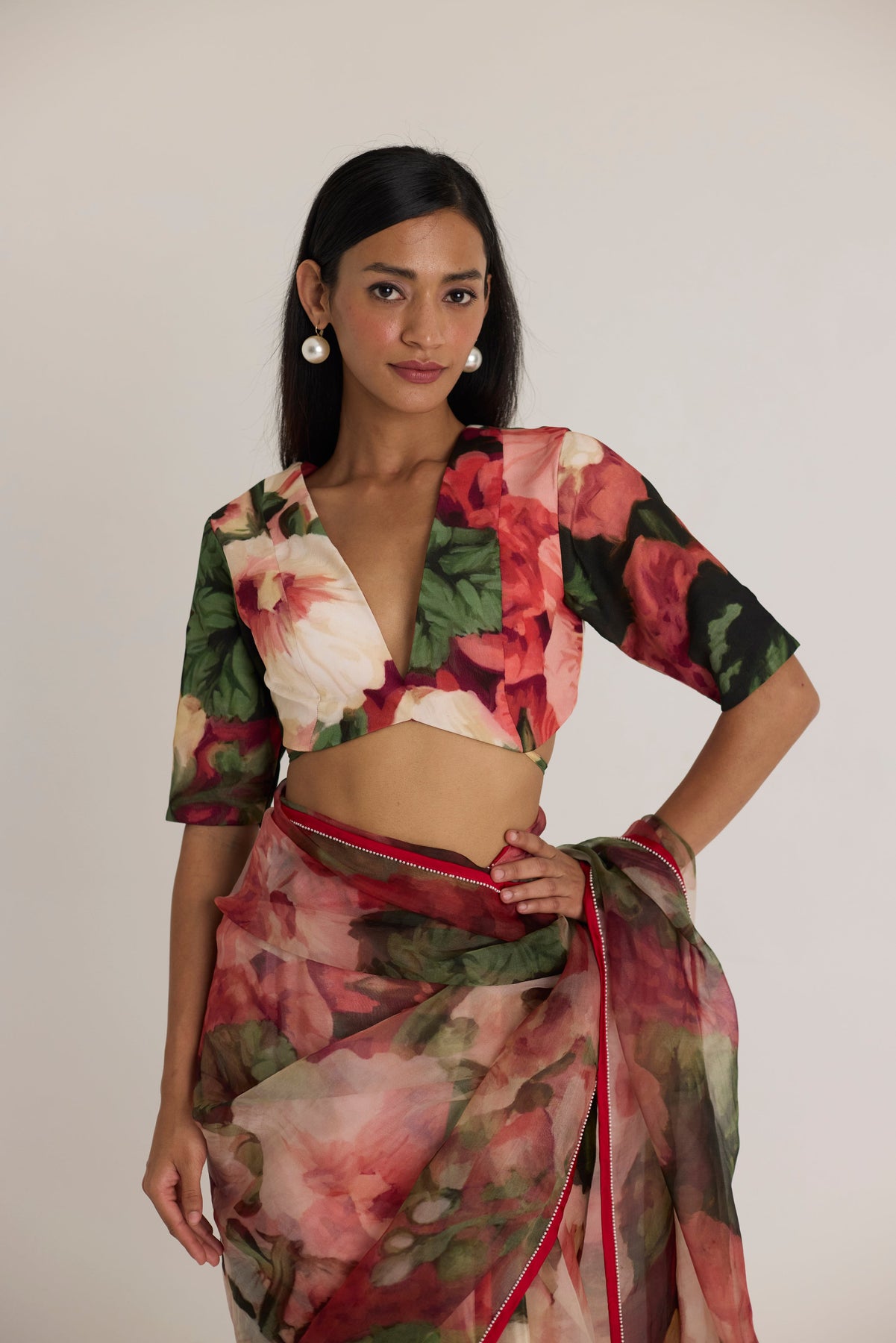 A dreamy, ethereal saree featuring a sheer fabric adorned with a painterly floral print in deep reds, pinks, and lush greens. The fluid drape and delicate red piping along the edges add to its timeless elegance, making it a versatile choice for both festive and formal occasions.