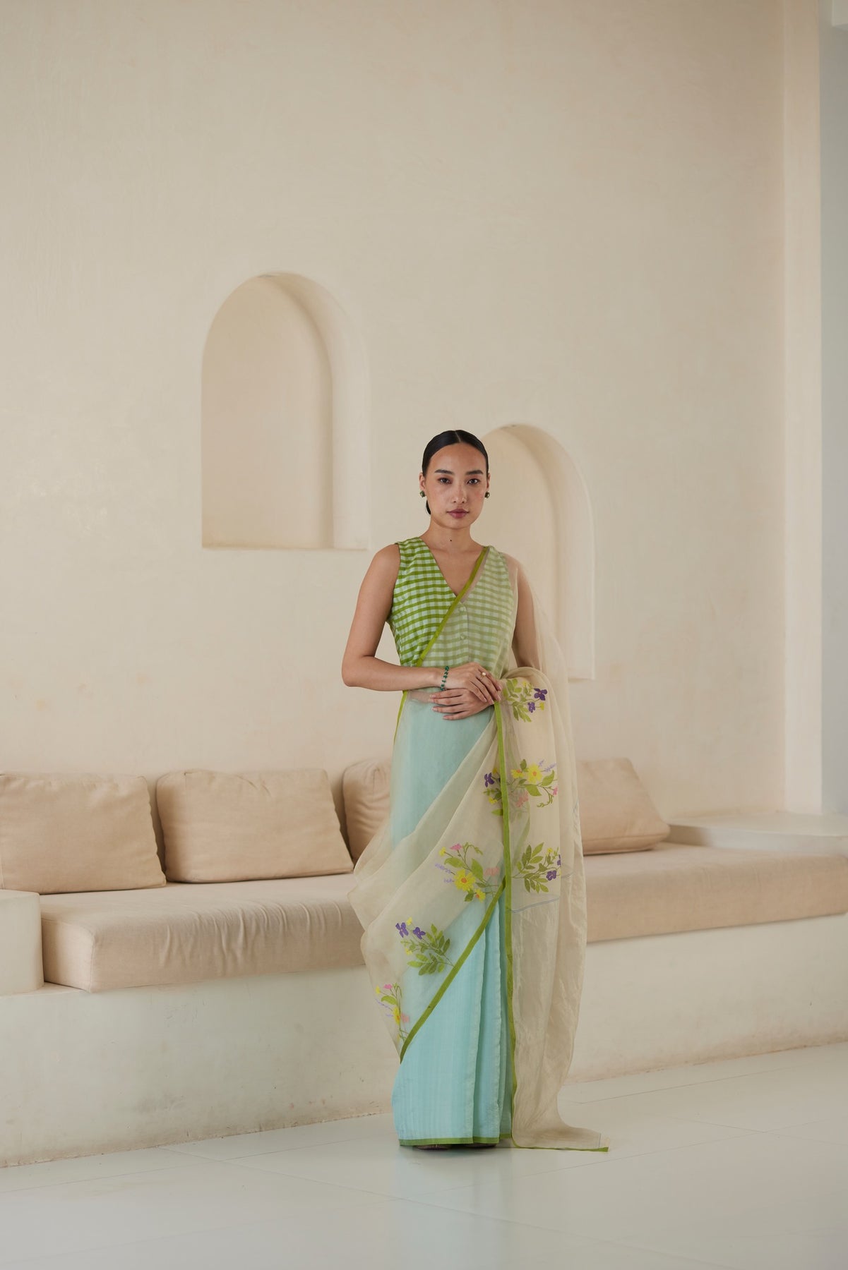 The Sisterhood Sonnet blouse features a handwoven gingham weave, and a silhouette inspired by a waistcoat. It is crafted in the finest handwoven silk khadi.