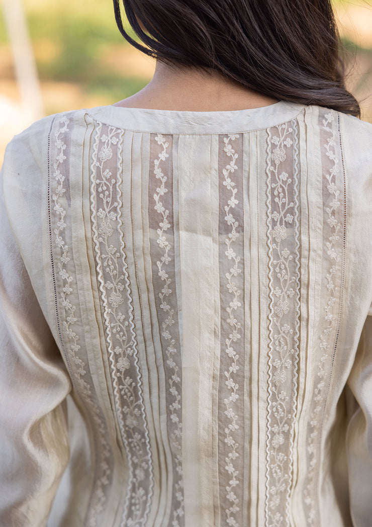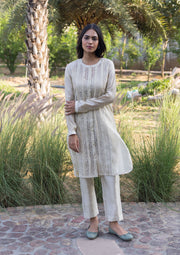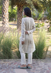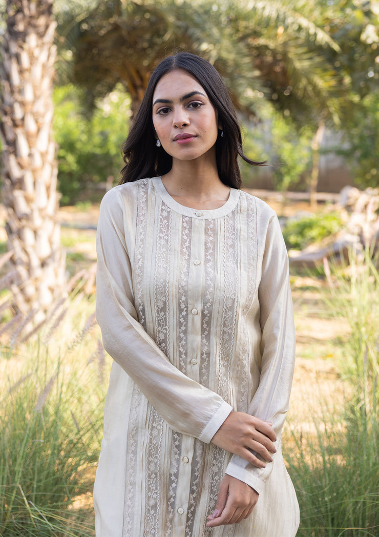 Crafted from handwoven organza mulberry silk, the knee-length kurta features intricate embroidery and stitching details that mimics the delicacy of lace, flowing effortlessly across the front and back. The rounded hem of the kurta adds a contemporary flair, while the front opening allows for ease and comfort.